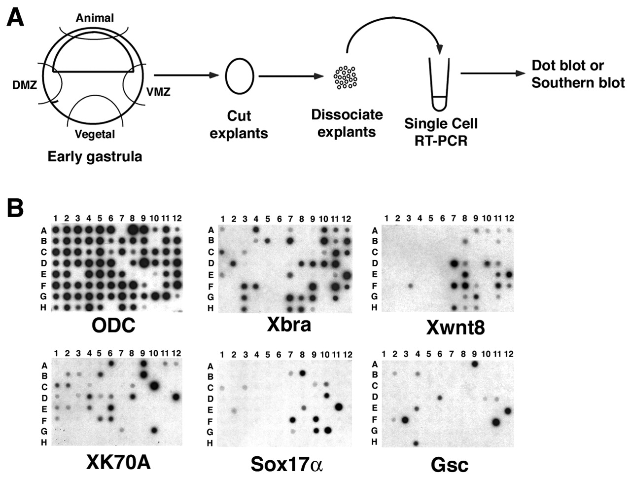 VMZ cells were isolated from stage 10 embryos and analyzed by dot blot or Southern blot (Fig. 2). Each block indicates the presence (coloured