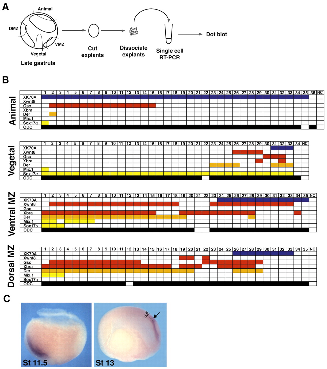 that did not show a signal for any marker are not included in the table. XK70A, an ectodermal gene, is represented in blue, mesodermal genes