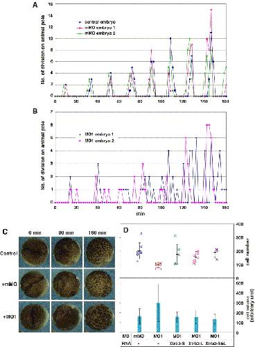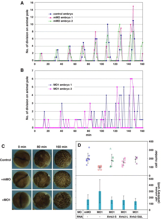 Fig. 6. Slow and asynchronous cleavage caused by suppression of Xtrb2 translation. (A, B) Embryos were either untreated or injected with mMO or MO1 and were subjected to time-lapse recording after the first cell division (when t = 0). The numbers of new cleavage furrows at each time point on the animal half of the embryos were counted and plotted during the time course. (C) Time-lapse images of the embryos at 0, 80, and 160 min. (D) Rescue of the delayed cell division phenotype by Xtrb2 RNA. Morpholino oligonucleotides (0.25 pmol) were injected into a single tier A blastomere of Xenopus embryos at the 32-cell stage, together with fluoresceinâdextran and Xtrb2-L or Xtrb2-S RNA, either individually (100 pg RNA) or in combination (50 pg of each RNA). Cells were dissociated and fixed at stage 9. The numbers of fluorescein-positive cells in each animal cap were counted, and their diameters were measured. The upper plot shows cell numbers derived from two independent experiments, and the bars indicate the average cell numbers per animal cap (±SD). The volumes of cells were estimated from their diameter, and their averages (±SD) are plotted in arbitrary units. The experiment involving coinjection of Xtrb2-L and Xtrb2-S RNA together with MO1 was carried out once. Xtrb2 RNAs rescue the cleavage defect caused by MO1 (P < 0.001).