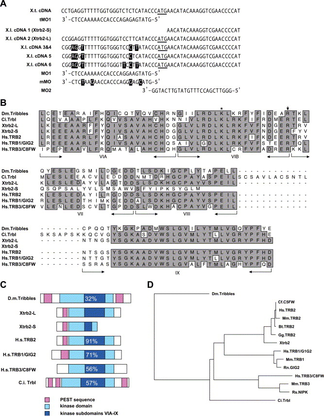 Fig. 1. Characterization of a Xenopus tribbles-like (Xtrb2) gene. (A) Portions of the sequences, centered on the start codon (underlined), of X. tropicalis (X.t.) and X. laevis (X.l.) Xtrb2 cDNAs, together with the antisense morpholino oligonucleotides used in this paper. Nucleotides that differ from the Xenopus laevis cDNA2 (Xtrb2-L) sequence are highlighted. (B) Amino acid sequence alignment of Drosophila Tribbles and Tribbles-like proteins in Ciona, Xenopus, and human in the kinase subdomains VIA-IX. Identical amino acid residues (in more than half of the sequences) are highlighted. The arrows indicate the serine/threonine kinase subdomains. The short arrow indicates the position of the junction between exons 2 and 3 of human TRB2. The asterisk indicates the lysine residue that is mutated to an arginine in the Drosophila TrblK266R allele. (C) Schematic drawings of Tribbles family proteins. % identities in the kinase domains of Xtrb2-L and the other family members are indicated. Accession numbers are H.s. TRB2, D87119; H.s. TRB1, AF205437; H.s. TRB3, NM025195; C.i. Trbl, AK113810. The PESTfind scores of potential PEST sequences are above +5 except in the C-terminus of Drosophila Tribbles and Ciona Trbl (+2.02 and +2.92, respectively). (D) Phylogenetic tree of the Tribbles protein family.