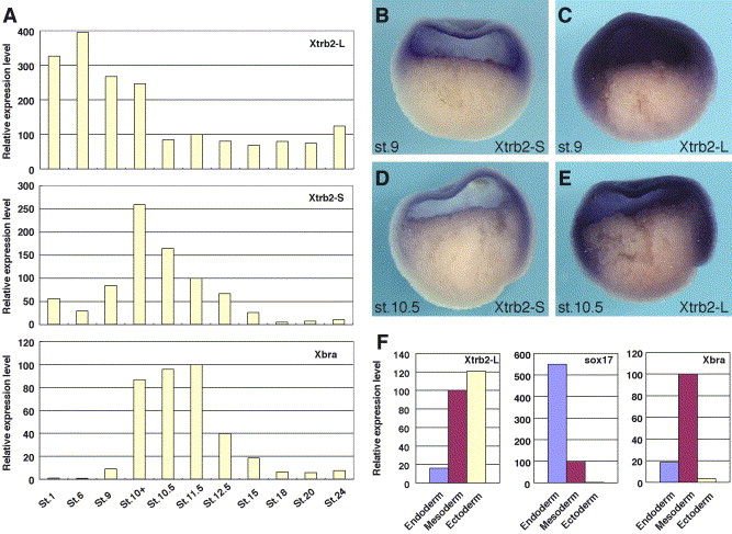 Fig. 2. Expression profile of Xtrb2 transcripts during early development of Xenopus laevis. (A) Expression profile of Xtrb2-S, Xtrb2-L, and Xbra at stages from fertilization to stage 24. The numbers are normalized against plakoglobin expression. (BâE) Whole mount in situ hybridization of Xtrb2-S (B, D) and Xtrb2-L (C, E) at stage 9 (B, C) and stage 10.5 (D, E). (F) Relative expression levels of Xtrb2-L in the three germ layers at stage 9 assayed by quantitative RTâPCR. Xtrb2-L is highly expressed in ectoderm and mesoderm, while sox17 and Xbra were expressed predominantly in endoderm and mesoderm, respectively. Data are normalized against the amount of input RNA.