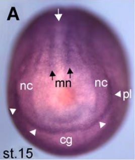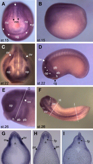 Fig. 3. Xtrb2 expression during early Xenopus embryogenesis. (A, B) In situ hybridization of Xtrb2 at stage 15. Anterior dorsal view (A) and lateral view (B) are shown. A white arrow indicates the dorsal midline. (C, D) Xtrb2 expression at stage 22/23. Anterior view of the head (C) and lateral view (D). Strong expression was observed in the optic placode, otic vesicle, and neural crest. Arrowheads indicate a streak of cells from the otic vesicle (ov) towards the cement gland (CG). Weak staining of somites was also detected. (EâI) Expression pattern of Xtrb2 at stage 26. Lateral view in the head (E), dorsal view (F), and transverse sections (GâI) as indicated in (E) and (F). Note the lack of Xtrb2 expression in the floorplate (fp) along the neural tube. Weak expression was observed in pronephros. Abbreviations: cg, cement gland; mn, motor neuron; nc, neural crest; pl, placodes; n, notochord; fp, floor plate; pn, pronephros; op, optic vesicle; ov, otic vesicle; ab, anterior branchial; pb, posterior branchial; h, hyoid neural crest.