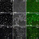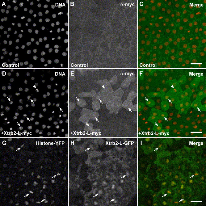 Fig. 4. Subcellular localization of the Xtrb2-L protein. (AâF) Stage 10 embryos either untreated (AâC) or injected with RNA encoding myc-tagged Xtrb2-L (DâF) were stained with anti-myc antibody (B, E) and the DNA dye SYTOX green (A, D). Merged images are also shown (C, F: green for anti-myc and red for DNA). Myc-tagged Xtrb2 was detected in the cytoplasm and, in some cells, in the nucleus (arrows). Weak staining was also observed in the region of the mitotic spindle (arrowhead). (GâI) A frame from a confocal movie of GFP-tagged Xtrb2-L expressed in live animal cap cells. RNA encoding histone H2B-YFP was injected to visualize nuclei. (G) Histone H2B-YFP. (H) Xtrb2-GFP. (I) Merged images (red for YFP and green for GFP). Xtrb2-GFP is associated with mitotic spindles (arrows) and with nuclei. Scale bar is 50 μm (AâF) or 40 μm (GâI).