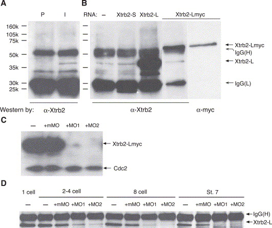 Fig. 5. Detection of Xtrb2 proteins in vivo and suppression of translation by antisense morpholino oligonucleotides. (A) Western blot of immunoprecipitates from stage 6.5 embryos either with preimmune (P) or anti-Xtrb2 (I) antisera. (B) Western blot of anti-Xtrb2 immunoprecipitates from stage 7 embryos. Protein extracts were prepared from 20 embryos either uninjected or injected with the indicated RNA; 0.5 ng/embryo of Xtrb2-S or Xtrb2-L RNA or 0.25 ng/embryo of myc-tagged Xtrb2-L RNA were injected. Asterisk indicates exogenous Xtrb2-S protein. Positions of Xtrb2-L, Xtrb2-Lmyc, as well the as IgG heavy chain and light chain [IgG(H) and IgG(L), respectively], are indicated. (C) Western blot of total embryo extract (40 μg per lane) with anti-myc and anti-cdc2 antibody. Extract was prepared from stage 6.5 embryos injected with myc-tagged Xtrb2-L RNA (500 pg) and MOs as indicated. (D) Anti-Xtrb2 Western blot of immunoprecipitates from 50 embryos either untreated or injected with MOs as indicated. Embryos were collected at the 2- to 4-cell stage (135 min after fertilization), the 8-cell stage (165 min after fertilization), or at blastula stage 7.