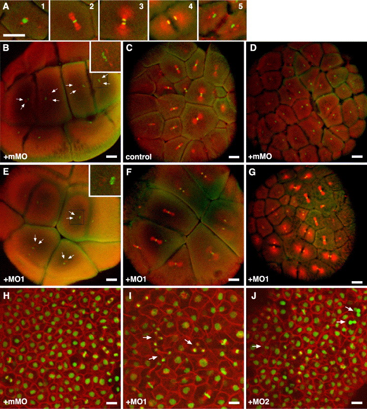 Fig. 7. Phenotypes of MO-injected embryos. The figure shows confocal images of embryos subjected to whole-mount staining using an anti-β-tubulin antibody (red) and SYTOXgreen DNA dye (green). Embryos are at early blastula stages (BâG) or midgastrula stage 11 (HâJ), either untreated or injected with 7 pmol of MOs at the 1-cell stage as indicated. 3D projections of a confocal Z series sections are shown. (A) Mitotic spindles in control embryos at prophase (1), metaphase (2), early anaphase (3), late anaphase/telophase (4), and telophase (5). Note that cytokinesis has started in (4) and that the microtubule organizing center (MTOC) has duplicated before completion of cytokinesis in (5). (B) Duplication of MTOCs has occurred (arrows) in cells in which cytokinesis is under way. Inset is a closeup view of the region marked by the black rectangle. (C, D) Control (C) and mMO-injected (D) embryos undergo synchronous cell division. (E) Cells of embryos injected with MO1 have duplicated their MTOCs (arrow), but cytokinesis has not yet begun. Inset is a magnified view of the region marked by the black rectangle. (F, G) Cells are at different stages of mitosis in embryos injected with MO1. (HâJ) Confocal images of cells in the animal pole region of Xenopus embryos at midgastrula stage 11. (H) No abnormal mitoses are observed in an embryo injected with mMO. (I) Abnormal tripolar spindles (arrows) are observed in embryos injected with MO1. (J) Binucleate cells (arrows) are observed in embryos injected with MO2. Scale bar is 100 μm (AâG) or 25 μm (HâJ).