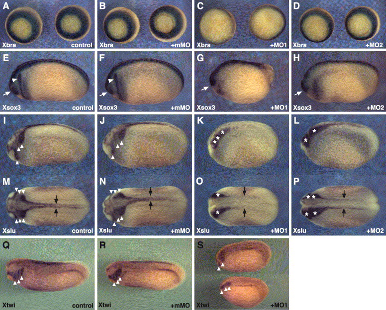 Fig. 8. Phenotypes of embryos injected with MO1 or MO2. Control embryos or embryos injected with antisense morpholino oligonucleotides were fixed and subjected to in situ hybridization using the indicated probes. (AâD) Xbra expression at stage 11. Embryos injected with MO1 (C) had reduced levels of Xbra expression, and gastrulation movements were delayed in comparison with control and mMO-injected embryos (A, B). MO2-injected embryos (D) also showed slight retardation of gastrulation. (EâH) Sox3 expression at stage 22. In control and mMO-injected embryos (E, F), Sox3 is expressed in presumptive lens ectoderm (PLE, arrows) and the dorsolateral placode (DLP, arrowheads). In contrast, Sox3 expression is absent or greatly reduced in the PLE and DLP of MO1- or MO2-injected embryos. (IâP) Slug expression at stage 22. Dorsal (IâL) and lateral (MâP) views are shown. Arrowheads (I, J, M, N) or asterisks (K, L, O, P) indicate cephalic neural crests. Note the absence of cephalic neural crest migration and the gap between rows of Xslug expression in the trunk (arrows) in MO1- and MO2-injected embryos. (QâS) Twist expression at stage 26. Cephalic neural crest migration (arrowheads) is abnormal in MO1 embryos.