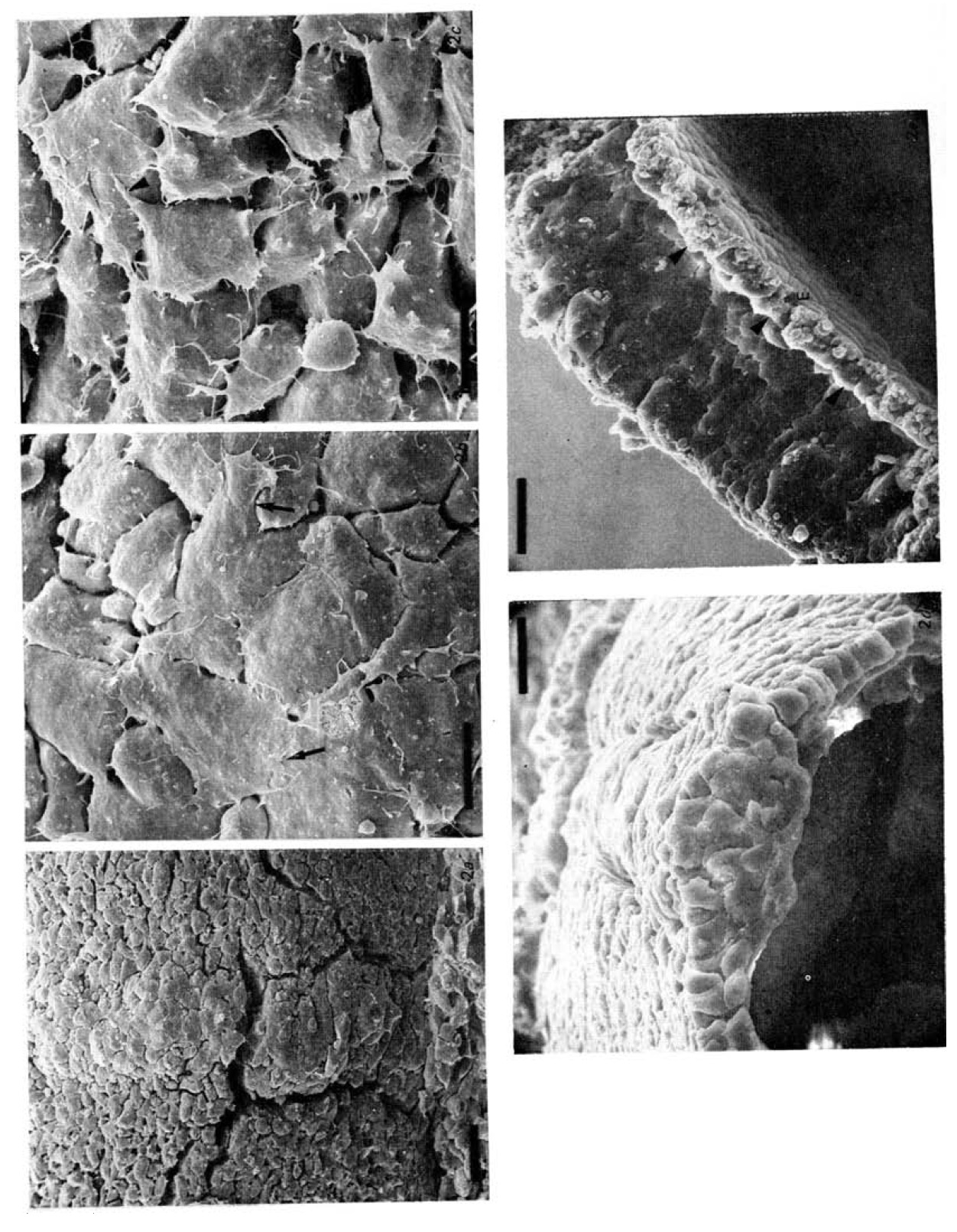 prevalence of larger intercellular spaces and filiform protrusions (pointer). Bar represents