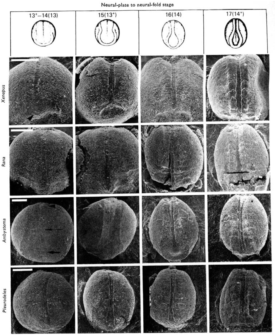 progress made by the neural folds of Ambystoma late neurulae viewed dorsally.