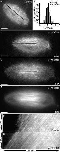 Figure 2. Dynactin inhibition with p150-CC1 suppresses microtubule depolymerization at spindle poles. Spindle microtubule dynamics were analyzed using fluorescent speckle microscopy. (A) Tubulin speckles in a control spindle. (B) Polewards velocities of tubulin speckles in control (white bars; 2.1 ± 0.3 μm/min, mean ± SD), or p150-CC1âtreated (2 μM p150-CC1, black bars; 2.1± 0.2 μm/min, mean ± SD) spindles (n = 12 for each condition, 120 speckles). Velocities were binned in 0.5 μm/min increments. (CâE) Images from a time-lapse video of a p150-CC1âtreated spindle (2 μM p150-CC1 added â¼3 min before image at t = 0) showing tubulin speckles (C and D) and tubulin distribution (E). The black lines in A, C, and D indicate the regions used to generate the kymographs shown in F and G, respectively (Videos 3 and 4). Times are in min:s. Bars, 10 μm.
