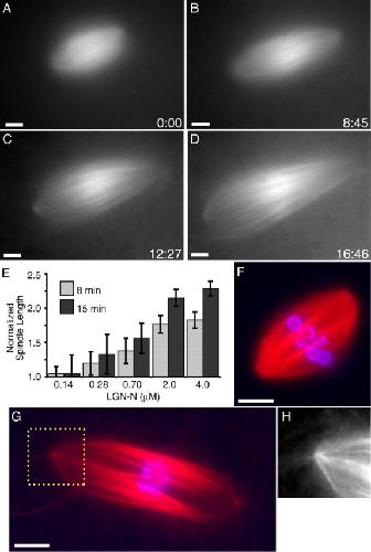 Figure 3. NuMA inhibition with LGN-N increases the length of spindle microtubules, in the presence or absence of centrosomes. (A–D) Tubulin distribution in an LGN-N–treated spindle (0.7 μM, added ∼3 min before image at t = 0) during live recordings (Video 5). (E) LGN-N was added to assembled spindles, samples were fixed after 8 or 15 min, spindle lengths were measured (mean ± SD, n = 15, two independent experiments), and normalized to the length of untreated spindles (40 μm). (F–H) Spindles assembled in the absence of centrosomes, around DNA beads (tubulin, red; DNA, blue). (F) Buffer control. (G) LGN-N–treated (2 μM, 8 min). (H) Higher magnified image of the region indicated in G. Times are in min:s. Bars, 10 μm.