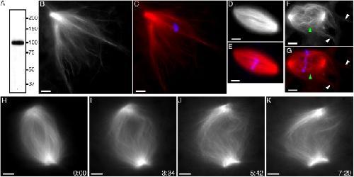 Figure 4. Kif2a is required for bipolar spindle assembly and the regulation of spindle microtubule length. (A) Western blot of Xenopus egg extracts stained with anti-Kif2a. Molecular weight standards are shown. (BâE) Anti-Kif2a inhibits bipolar spindle assembly. Anti-Kif2a (0.7 mg/ml; B and C) or control buffer (D and E) were added at the start of assembly reactions. (B and D) Tubulin alone. (C and E) Overlay (tubulin, red; DNA, blue). (FâK) Anti-Kif2a (0.7 mg/ml) was added to assembled spindles. (F and G) 8 min after antibody addition. Long microtubule bundles extended beyond (white arrowheads), and buckled (green arrowheads) within the spindle. (F) Tubulin alone. (G) Overlay (tubulin, red; DNA, blue). (HâK) Real-time analysis of a spindle treated with anti-Kif2a (added â¼3 min before image at t = 0; Video 6). Times are in min:s. Bars, 10 μm.