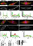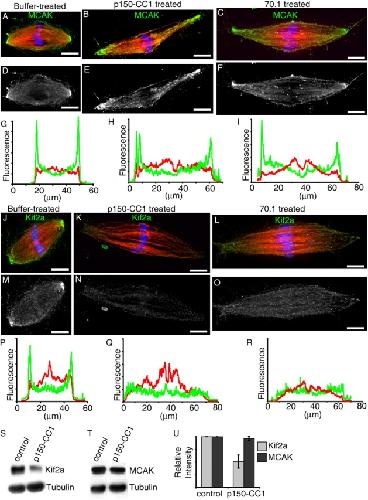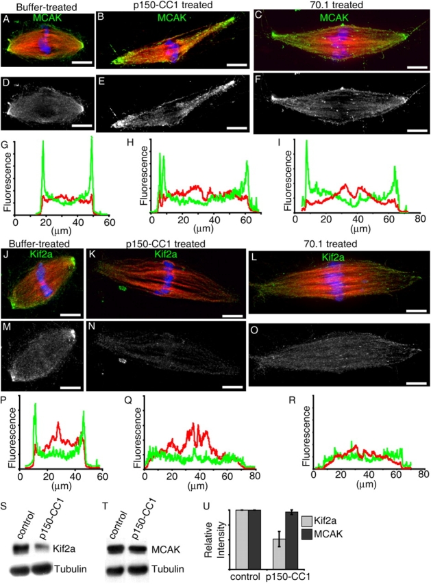 Figure 5. Treatment with p150-CC1 or 70.1 displaces Kif2a, but not MCAK from spindle poles. Assembled spindles, after addition of buffer, p150-CC1, or 70.1, were processed for immunofluorescence. MCAK staining in control (A and D), p150-CC1–treated (2 μM, 15 min; B and E), and 70.1-treated (1 mg/ml, 15 min; C and F) spindles. (A–C) Overlays (tubulin, red; DNA, blue; MCAK, green). (D–F) MCAK alone. (G–I) Line scans of fluorescence intensity (MCAK, green; tubulin, red; arbitrary units) across the pole to pole axis of the spindles shown in A–C. Kif2a staining in untreated (J and M), p150-CC1–treated (2 μM, 15 min; K and N), and 70.1-treated (1 mg/ml, 15 min; L and O) spindles. (J–L) Overlays (tubulin, red; DNA, blue; Kif2a, green). (M–O) Kif2a alone. (P–R) Line scans of fluorescence intensity (Kif2a, green; tubulin, red; arbitrary units) across the pole to pole axis of the spindles shown in (J–L). (S and T) Spindles were treated for 15 min with p150-CC1 (4 μM) or control buffer and the relative amount of Kif2a (S), or MCAK (T), and tubulin associated with partially purified spindle pellets was analyzed by immunoblotting. (U) Quantitation of spindle-associated Kif2a and MCAK relative to tubulin from measurements of immunoblot band intensities (mean ± SD, two independent experiments), normalized to intensities from untreated spindles. Bars, 10 μm.