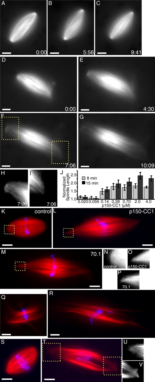 Figure 1. Dynein/dynactin inhibition increases the length of spindle microtubules in the presence or absence of centrosomes. (A–C) Tubulin distribution in untreated spindles during live recordings. (D–G) p150-CC1 addition (2 μM, ∼3 min before image at t = 0) caused spindles to increase in length. (H and I) Higher magnified spindle pole regions indicated in F (Videos 1 and 2). (J) p150-CC1 was added to assembled spindles, samples were fixed after 8 or 15 min, spindle lengths were measured (mean ± SD, n = 15, two independent experiments), and normalized to the length of untreated spindles (40 μm). (K–M) Spindles fixed 8 min after addition of control buffer (K), 2 μM p150-CC1 (L), or 1 mg/ml 70.1 (M) (tubulin, red; DNA, blue). (N–P) Higher magnified, contrast-adjusted regions indicated in K–M, respectively. (Q and R) Spindles assembled in 18 μm p50 dynamitin were treated with control buffer (Q) or 2 μm p150-CC1 (R) and fixed after 15 min (tubulin, red; DNA, blue). (S and T) Spindles assembled in the absence of centrosomes, around DNA-beads (tubulin, red; DNA, blue). (S) Buffer control. (T) p150-CC1–treated (2 μM, 8 min). (U and V) Higher magnified, contrast-adjusted regions indicated in R. Times are in min:s. Bars, 10 μm.