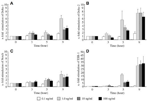 Fig. 1. Time course analysis of Delta-1, Delta-2, Notch and ESR-1 mRNA expression induced by activin A by real-time RT-PCR. RNA samples were derived from stage-9 animal caps which were treated with 0.1, 1.0, 10, and 100 ng/ml activin A for 1 hour, and then cultured for 3, 5 and 9 hours. The expression levels of Delta-1 (A), Delta-2 (B), Notch (C) and ESR-1 (D) mRNA were quantified by real-time RT-PCR. The relative "stimulation fold" was calculated as the individual expression in activin A-treated animal caps relative to that in untreated animal caps at each developmental stage. The efficiency of cDNA synthesis from mRNA was assessed on the basis of real-time RT-PCR for ODC. The results represent the mean from three or four independent experiments, and error bars indicate the SEM.