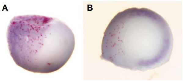 Fig. 4. The effects of MyoD injection on Delta-1 and Delta-2 expression in vivo. Embryos were injected with 1.0 ng MyoD mRNA together with 100 pg of lacZ mRNA as lineage tracer into one blastomere at the 2-cell stage. The expression pattern of Delta-1 (A) (lateral view) and Delta-2 (B) (vegetal view) at stage 11 was examined by whole mount in situ hybridization.