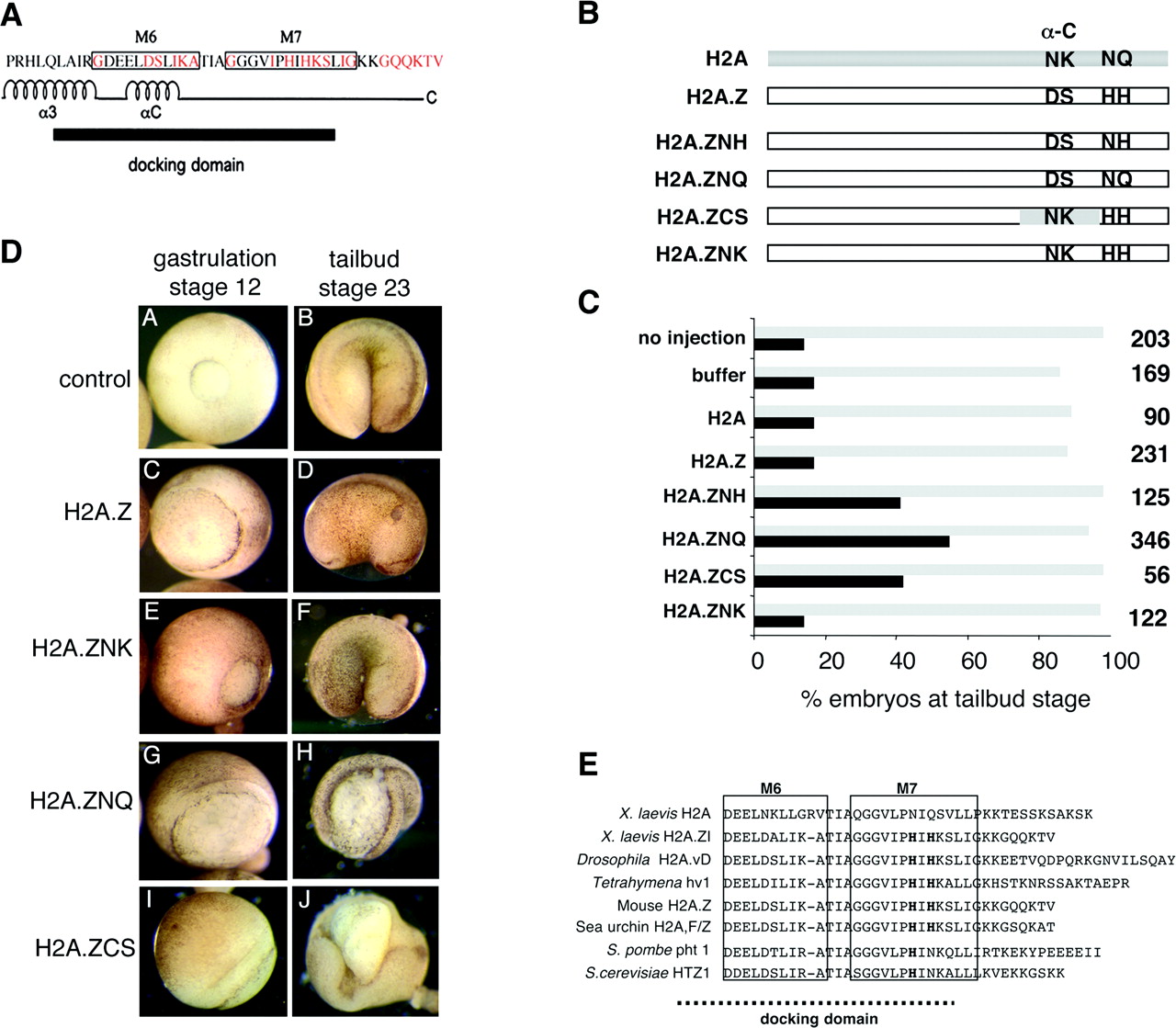 tailbud (panels B, D, F, H, and J). Dorsal views of defective tailbud embryos are shown in panels H and J. E, sequence comparison of H2A.Z protein