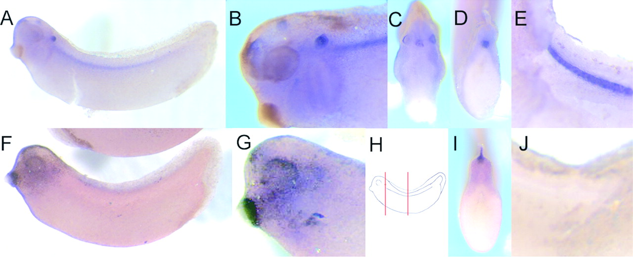 mid-trunk (39 min). E, exposed notochord (37 min). FâJ, control embryos