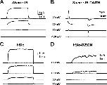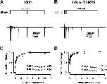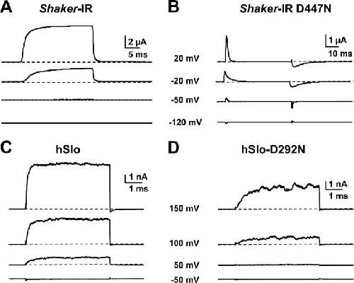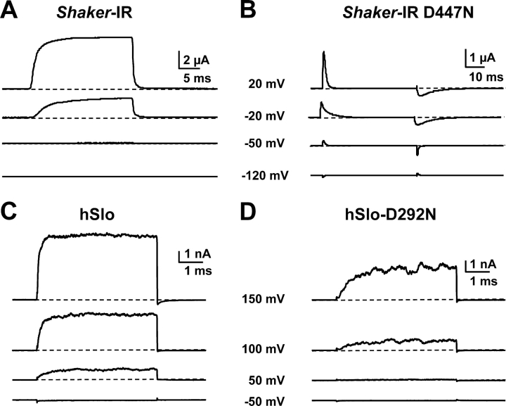Figure 1. . The D447N pore mutation prevents conduction in Shaker K+ channel, while the corresponding D292N pore mutation in hSlo channel allows conduction. (A) Outward K+ current recorded with the cut open oocyte voltage clamp, from oocytes expressing Sh-IR; the current was elicited by voltage pulses as indicated for each trace, from an HP of −90 mV. (B) Current records from an oocyte expressing Sh-IR D447N channels. The fast upward and downward deflections at the beginning and end of the voltage pulses are the gating currents recorded unsubtracted during depolarizations from HP = −90 mV to the indicated potentials. (C and D) Typical current records from inside-out membrane patches from oocytes expressing hSlo and hSlo-D292N respectively, with 1.5 μM internal free Ca2+. HP was 0 mV. Current records were obtained 2 d (hSlo) and 4 d (hSlo-D292N) after oocyte injection; the amount of cRNA for hSlo-D292N was also 10 times higher than for hSlo. Note that the same voltage step elicited a larger and faster activating ionic current in wild-type hSlo than in the D292N mutant.