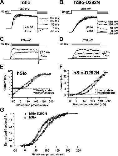 Figure 2. . Shift to more depolarized potentials of the voltage activation curve by the D292N mutation. (A and B) Current traces elicited by pulses to 250 mV followed by repolarizations to the indicated potentials, for hSlo (A) and hSlo-D292N (B). (C and D) Current traces elicited by 40-ms voltage steps to −50, 0, 50, 100, 150 mV from HP-50 mV (same patches as in A and B). (E and F) Instantaneous (Δ) and steady-state (○) I–V relationships for hSlo (E) and hSlo-D292N (F). The instantaneous I–V curve was measured in tail currents 40 μs after repolarization. hSlo channels have a more pronounced voltage-dependent block at positive potentials for both steady and tail currents. On the other hand, hSlo-D292N channels have a strong reduction of the instantaneous conductance at potentials more negative than +50 mV. (G) fPo vs. voltage relationship for hSlo (○) and hSlo-D292N (Δ). Averaged data points (n = 3) were fitted to a double Boltzmann distribution. The parameters of the fitting are Z1 = 1.7, Z2 = 1.1, V1/21 = 61 mV, V1/22 = 111 mV, A1 = 0.65 (hSlo) and 0.30 (hSlo-D292N), A2 = 0.35 (hSlo) and 0.70 (hSlo-D292N). Inside-out membrane patches in 120 mM symmetrical K+ and 1.5 μM free [Ca2+].