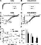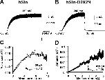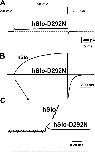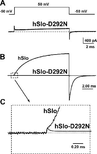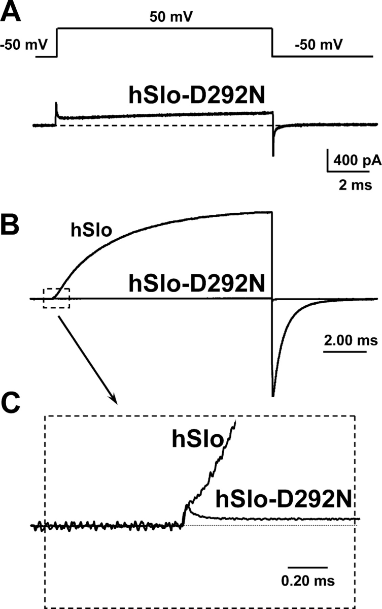 Figure 3. . The D292N mutation reduces the coupling between voltage sensor movement and pore opening. (A and B) Current recordings from inside-out patches expressing hSlo-D292N and hSlo. The currents were elicited by a voltage pulse to 50 mV, from an HP of −50 mV, and the linear component of the current was subtracted off-line (subtracting pulse was to −150 mV from −100 mV). (B) The traces of both hSlo and hSlo-D292N superimposed and normalized to the size of the gating current. The inset (C) shows the ON gating current from B on an enlarged scale. Note that, in proportion, a similar charge displacement elicits a much smaller ionic current in hSlo-D292N than in hSlo. Recordings performed in 110 mM NMG-MES, 10 mM KMES, and 1.5 μM free Ca2+.