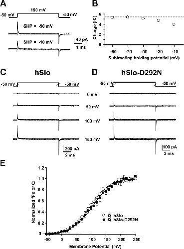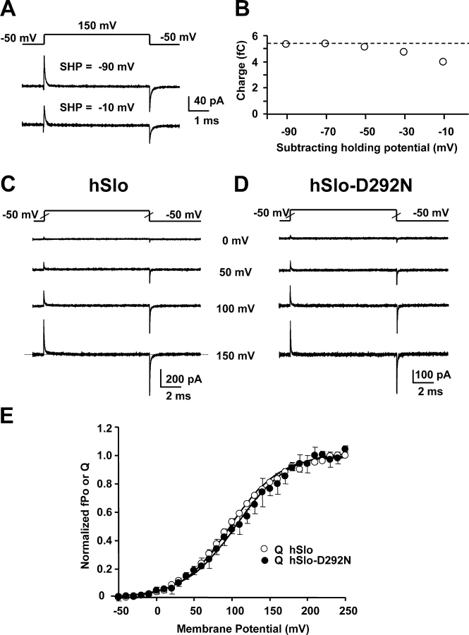 Figure 4. . The Q–V curves in hSlo and hSlo-D292N. (A) Gating current recordings from inside-out patches expressing hSlo, in symmetrical 120 mM TEA-MES and 1.5 μM free Ca2+, elicited by voltage pulses (shown above the recordings) from −50 mV to 150 mV. The linear capacity transients were subtracted off-line by using different SHPs, as indicated for each trace. (B) Plot of the absolute value of the time integral of OFF gating currents vs. SHP for hSlo. Identical results were obtained for hSlo-D292N. Note that for SHP negative to −50 mV, the charge remains unchanged. (C and D) Gating currents recorded from inside-out patches from oocytes expressing hSlo (C) and hSlo-D292N (D), in symmetrical 120 mM TEA-MES, with 1.5 μM free Ca2+. The currents were elicited by 10-ms voltage steps to the indicated voltages. Each trace is subtracted with a subtracting pulse from a holding of −100 mV to −150 mV. (E) Averaged and normalized Q–V curves estimated from the OFF gating current for hSlo (○) and hSlo-D292N (•) (n = 3 ± SEM). Curves were normalized to the mean charge calculated for voltage steps to 230 mV, 240 mV, and 250 mV. The two Q–V curves were fitted to a single Boltzmann distribution in the form 1/(1+exp(zF(Vhalf − V)/ RT)), where F, R, and T are the usual thermodynamic parameters. Parameters fitting were for hSlo: Vhalf = 96 mV and z = 0.77, for hSlo-D292N: Vhalf = 106 mV and z = 0.74.