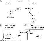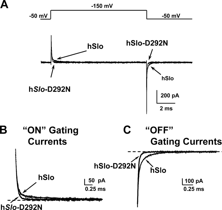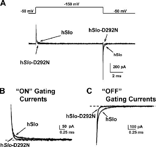 Figure 5. . The slow component of gating currents is reduced in the hSlo-D292N channel. (A) Gating current traces for hSlo and hSlo-D292N for a pulse from −50 mV to 150 mV. (B) ON gating currents (inset of A) with τfast = 0.052 ms and τslow = 1.1 ms; the slow component amplitude was reduced from 70% in hSlo to 25% in hSlo-D292N. (C) OFF gating currents (inset of A) with superimposed fits: τfast = 0.022 ms, τmedium = 0.083 ms, τslow = 0.350 ms, for both clones; the relative amplitudes of the components were Afast = 51%, Amedium = 35%, and Aslow = 14% for hSlo, and Afast = 89%, Amedium = 10%, and Aslow = 1% for hslo D292N. Gating current recordings in 120 mM TEAMES and 1.5 μM free Ca2+.