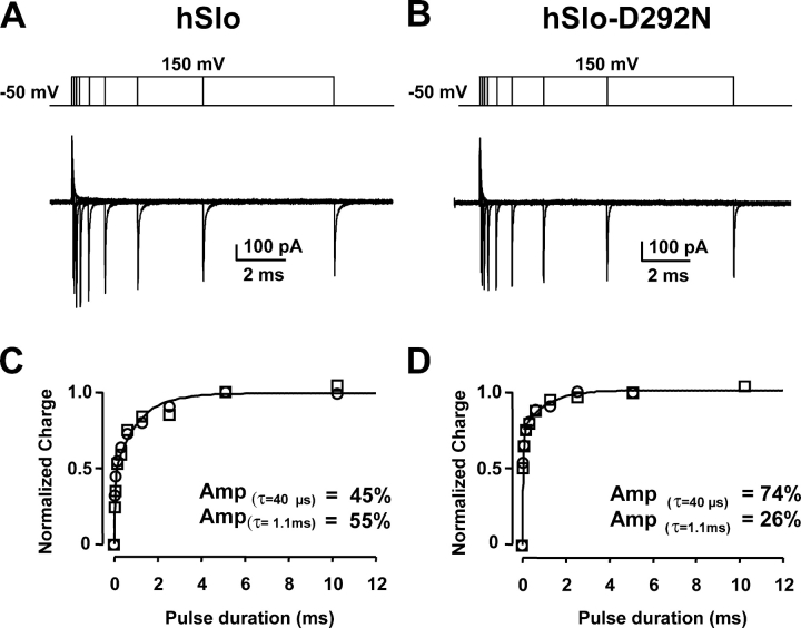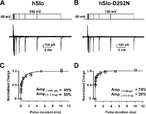 Figure 6. . Reduction of the charge movement slow component in the hSlo-D292N channel. OFF gating currents in hSlo (A) and hSlo-D292N (B) elicited by voltage pulses from HP −50 mV to 150 mV of increasing durations, ranging from 40 μs to 10.2 ms. (C and D) OFF charge from two experiments as in A and B plotted as a function of the pulse duration. Data were normalized to the charge displaced by the 5.1-ms pulse and fitted to a bi-exponential function with a single fast (40 μs) and slow (1.1 ms) time constant. The charge movement slow component was reduced from 55% in hSlo to 26% in hSlo-D292N. Gating current recordings in 120 mM TEAMES and 1.5 μM free Ca2+.