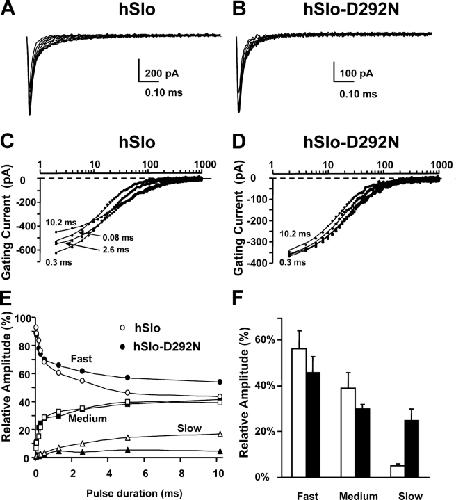Figure 7. . OFF gating current components with different pulse durations. (A and B) Superimposed OFF gating currents following different pulse durations (0.04 ms to 10.2 ms) in hSlo and hSlo-D292N as shown in Fig. 6 (A and B). Note the more prominent slow components in hSlo. (C and D) Selected traces from A and B with superimposed fits to the sum of three exponential functions. (D) Relative amplitudes of fast, slow, and medium components as function the pulse durations for hSlo (open symbols) and hSlo-D292N (filled symbols) with τfast = 0.017 ms, τmedium = 0.062 ms, and τslow = 0.278 ms for both clones. Note that the amplitude of the slow component was greatly diminished in hSlo-D292N. (E) Average values in hSlo (n = 6) and hSlo-D292N (n = 9) of the relative amplitude of fast, medium, and slow OFF gating current components at −50 mV following a 10.2-ms pulse to 150 mV. Time constant values were: hSlo, τfast = 0.020 ± 0.003 ms, τmedium = 0.062 ± 0.01 ms, and τslow = 0.371 ± 0.140 ms; hSlo-D292N, τfast = 0.019 ± 0.003 ms, τmedium = 0.059 ± 0.007 ms, and τslow = 0.333 ± 0.054 ms.