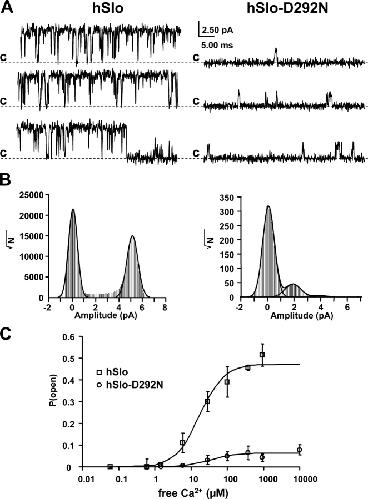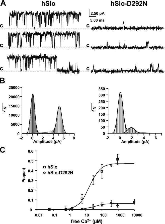 Figure 8. . The Po at limiting [Ca2+]i at 0 mV is significantly lower in hSlo-D292N than in hSlo. (A) Single channel activity from inside out patches of oocytes expressing hSlo (left) and hSlo-D292N (right) channels. Recordings at 0 mV, in asymmetric K+ concentration ([K+]o = 5 mM, [K+]i = 120 mM) with 400 μM free [Ca2+]i. (B) Total point histograms from the experiment in A. (C) Po vs. [Ca2+]i plot at 0 mV for hSlo and hSlo-D292N. Each point is the average of three patches of hSlo channels and six membrane patches for hSlo-D292N channels. The data were fitted to the Hill equation (Po = MaxPo/(1+(K1/2/[Ca])n)), with n = 1.3, MaxPo = 0.06 D292N, and n = 1.7, MaxPo = 0.47 for WT. K1/2 = 19.5 μM for both channels.