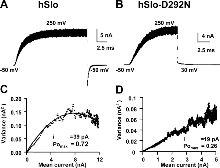 Figure 9. . Variance analysis shows a reduced limiting Po for the mutant hSlo-D292N channels. (A and B) Superimposed K+ current traces (100) recorded with pulses from −50 mV to 250 mV in 120 symmetrical K-MES with 1.5 μM free Ca2+ from hSlo (A) and hSlo-D292N (B). (C and D) Variance–mean current plots in two other patches for hSlo (C) and hSlo D292N (D). Data points were fitted to σ2(t) = I(t)i − (I(t)2/N), where σ2 is the variance, I the mean current, i the single channel current, and N the number of channels. Values were for hSlo POmax = 0.72, i = 39 pA, and N = 419, and for hSlo-D292N POmax = 0.26, i = 19 pA, and N = 1,000.