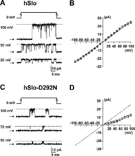 Figure 2. . Single channel conductance reduction by the D292N mutation. Single channel currents were recorded from excised inside-out patches of Xenopus oocytes injected with hSlo (A) and hSlo-D292N (C). 40-ms voltage pulses to various potentials (numbers at left) were applied from 0-mV holding potential. The closed state indicated with arrows and the open channel current level is indicated with a dotted line. The recordings are done in symmetrical 120 mM K+ solutions with contaminant Ca2+. (B and D) Single channel I–V curves (hSlo, n = 5, and hSlo-D292N, n = 7). The outward conductance of the hSlo-D292N channel is approximately half of the conductance of the hSlo channel.