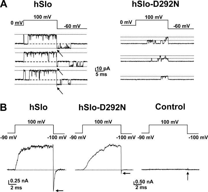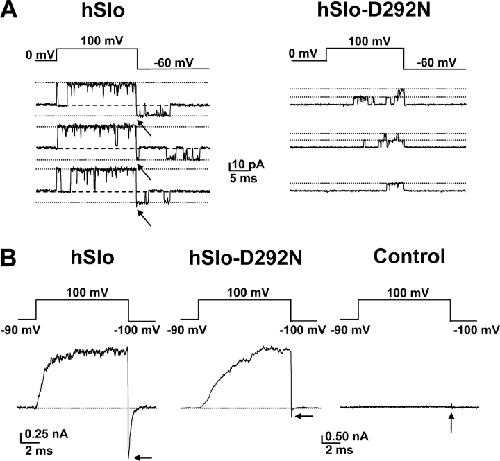 Figure 3. . Drastic reduction of inward currents by the D292N mutation. (A) Current recordings from inside-out patches of oocytes expressing hSlo (left) and hSlo-D292N (right) channels. The voltage protocol is shown above the current traces. Note the lack of detectable single channel tail currents for the mutant channels (right). Linear components were subtracted using traces without channel openings. (B) Macroscopic current recordings from hSlo (left), hSlo-D292N (middle), and uninjected oocyte (right). The current was elicited by the voltage protocol shown above the traces, with a P/4 subtraction protocol from −90 mV subtracting holding potential. Note the smaller tail current amplitude of hSlo-D292N when compared with hSlo.