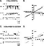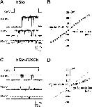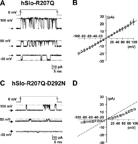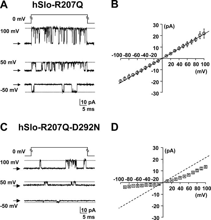 Figure 4. . Detection of single channel openings in the hSlo-R207Q-D292N mutant. Single channel current recordings at selected potentials from inside-out patches in symmetrical 120 mM K+ and contaminant Ca2+. (A and B) hSlo-R207Q and hSlo-R207Q-D292N channel activity during 40-ms voltage pulses to various potentials from HP = 0 mV. Linear components were subtracted using traces without channel openings. The closed channel current level is indicated with arrows, and the open channel current level is indicated with a dotted line. Average single channel I–V curves for hSlo-R207Q (n = 3) and hSlo-R207Q-D292N (n = 5) are shown in B and D, respectively.