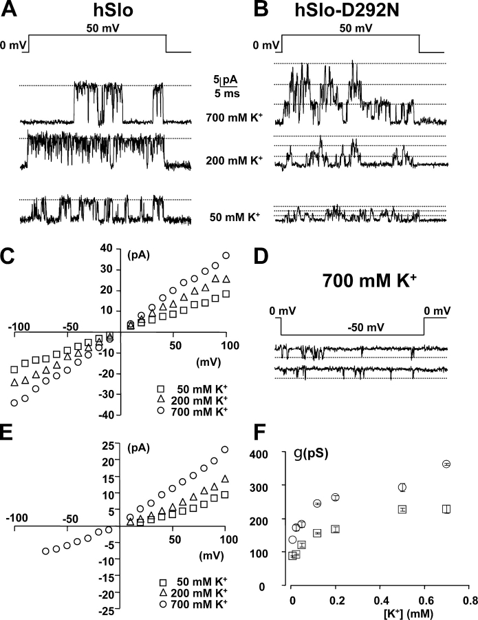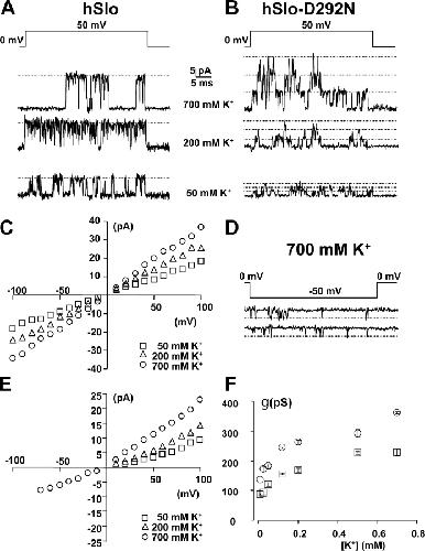 Figure 5. . Effect of symmetric [K+] on single channel conductance in hSlo and hSlo-D292N channels. Single channel current recordings from inside-out patches of oocytes expressing hSlo (A) and hSlo-D292N (B) are shown in various symmetrical [K+] in contaminant Ca2+. The current is elicited with 40-ms steps to +50 mV (A and B) and −50 mV (D) from 0-mV holding potential. The patch in B contains at least three channels. Note in D inward channel openings in hSlo-D292N at −50 mV and 700 mM symmetrical [K+]. Linear components were subtracted using traces without channel openings. (C and E) Single channel I–V curves for hSlo and hSlo-D292N, respectively. No inward single channels were detected in hSlo-D292N in 50 (□) or 200 (▵) mM K+. (F) Single channel conductance vs. [K+] plot for hSlo (○) and hSlo-D292N (□) channels. The single channel conductance was estimated from the linear range of the I–V relationship between +50 and +100 mV. The ionic strength of the solution was not kept constant, but increased with [K+].