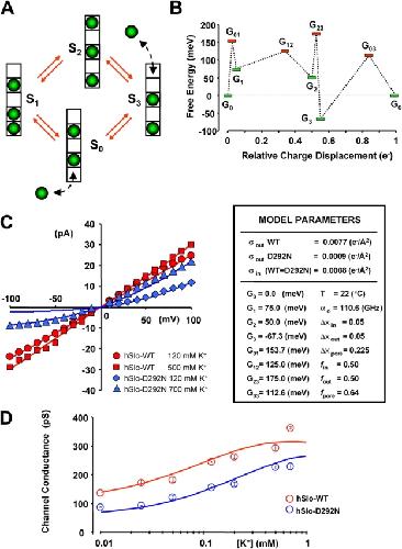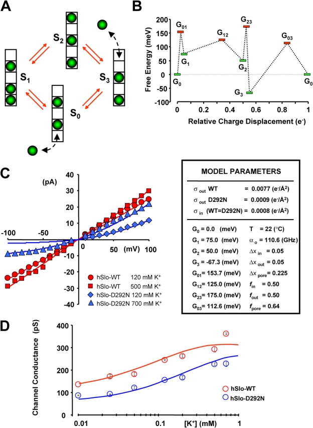 Figure 6. . A conduction model for hSlo and hSlo-D292N channels. (A) State diagram for a cyclic four-state model illustrating the metastable states of pore occupancy. The selectivity filter contains five K+ binding sites; K+ ions are depicted as green spheres. (B) Schematic free energy landscape for both hSlo and hSlo-D292N channels in standard conditions (symmetric 120 mM K+, no surface charge, and zero potential) during one permeation cycle. The landscape illustrates the free energy of the entire system “pore + ions” in different state of occupancy. The minima (G0–3) are to the energies of the metastable states S0–3. The maxima (G01–12–23–03) are the transition energies. Results of model fitting to experimental data are shown in C and D. (C) Experimental (symbols) and fitted (lines) single channel I–V curves for WT hSlo (red) and hSlo-D292N (blue) at indicated symmetrical [K+]. (D) Experimental (symbols) and fitted (lines) single channel chord conductance vs. [K+] for hSlo (red) and hSlo-D292N (blue). The insert shows the model parameters. α0 is the preexponential factor; G0–3 are the free energies of the states S0–3; G01–12–23–03 are the transition state energies; Δxin and Δxout, are the fractional voltage drops on internal and external ion entry, respectively; Δxpore is fractional voltage drops between two K+ binding sites within the pore; σout and σin are the external and internal surface charge densities, respectively. f is the position of the transition barriers. See for detailed description of model parameters.
