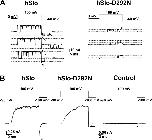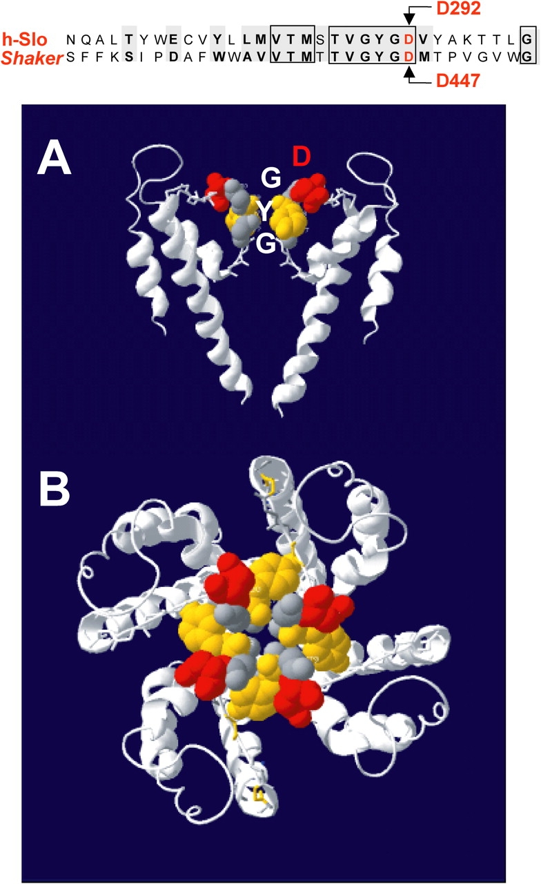 Figure 1. . The D292N mutation neutralizes the negatively charged aspartic acid in the GYGD selectivity filter of the pore. The top panel shows the amino acid sequence alignment corresponding to the pore regions of hSlo and Shaker K+ channels. The boxes enclose identical amino acids, while gray background shows residues with conserved properties. (A) Two of the four monomers that constitute a functional K+ channel based on the crystal structure of KcsA proposed by Doyle et al. (1998). A probable arrangement of the conserved sequence of the pore region corresponding to the selectivity filter is shown. (B) The arrangement of all four monomers viewed from the top, revealing the central pore of the conduction pathway and the position of the four aspartates (red) lining the pore vestibule.