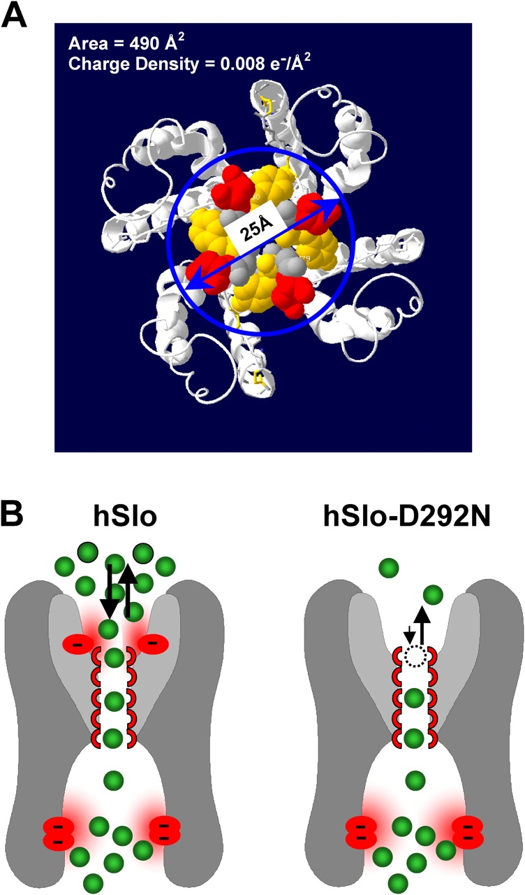 Figure 7. . A molecular and functional model of the pore region. (A) Simple estimate of the surface charge density in hSlo by considering the area delimited by the circle (25 Å diameter). A surface charge density of ∼0.008 e−/Å2 can be estimated for the area including the four negative charges of the D292 residues. This value is very close to the fitted value of 0.0077 e−/Å2. (B) Cartoon representation of the proposed role of D292 as a site for accumulating K+ ions in the outer vestibule. The selectivity filter is depicted with five K+ binding sites. The reduced [K+] in the outer vestibule of hSlo-D292N results in reduced accessibility of K+ to the outer binding site of the selectivity filter. Inner negative charge residues participating in ion conduction are shown at the bottom of the inner vestibule (Brelidze et al., 2003; Nimigean et al., 2003).
