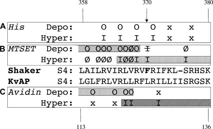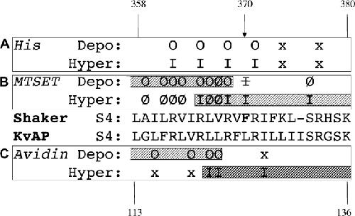 Figure 1. . Summary of S4 accessibility determinations in Shaker and KvAP channels. O and I denote accessibility to outside and inside solutions; x, no effect; Ø and I, not accessible to outside and inside, respectively. (A) Accessibility of substituted histidine residues to hydrogen ions in Shaker (Starace and Bezanilla, 2001). (B) Accessibility of Shaker substituted cysteine residues to MTSET; data summarized from Table I of Bezanilla (2000). (C) Sensitivity of biotinylated KvAP cysteine mutants to avidin, from Jiang et al. (2003).
