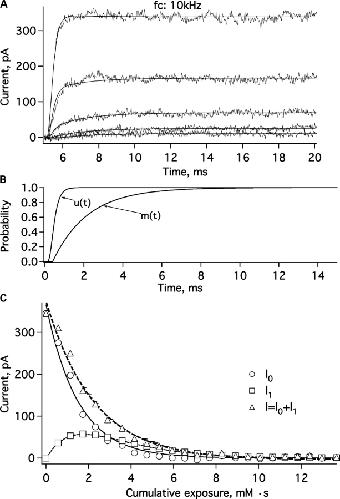 Figure 4. . Description of the MTSET modification effects at +80 mV. (A) Five representative F370C channel current sweeps recorded from the same inside-out patch as in Fig. 3 B. Fits to the activation time courses (smooth curves) were computed as sums of two exponential components. (B) The two exponential components u(t) and m(t), which are interpreted to be the normalized channel open probabilities of unmodified channels and one-subunit modified channels. (C) The amplitudes I0 and I1 of the two components, obtained from fits to sweeps at various times during the MTSET modification. The decays of the first component amplitude (circles) and the second component amplitude (squares) were fitted simultaneously to Eqs. 2, 4, and 5, yielding the subunit modification rate k = 0.165 ± 0.007 mM−1·s−1 and the amplitudes A = 366 ± 9 pA and B = 136 ± 0.4 pA. The total current amplitude (triangles) can alternatively be fitted by a single exponential with a decay rate of 0.46 ± 0.02 mM−1·s−1 (dashed curve).