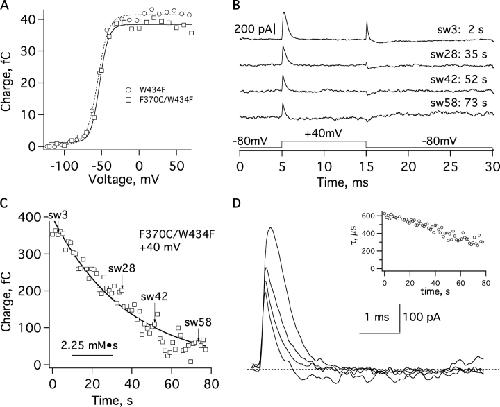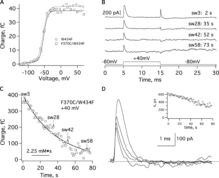 Figure 6. . F370C channel gating currents and the effect of MTSET. (A) The voltage dependence of charge movement in W434F and F370C/W434F channels is very similar. Boltzmann fits of integrated on currents yielded V1/2 = −55 mV and z = 3.4, and V1/2 = −53 mV and z = 4.2, respectively. The on currents were recorded from depolarizations of 10 ms duration. (B) Four gating current sweeps recorded from an inside-out patch with 0.2 mM, 15-min-old MTSET perfused. The sweep number and exposure duration are given for each trace. Upward off transients result from errors in the P/4 subtraction, and the unstable baseline due to increased leakage current is visible in the bottom traces. (C) Charges were integrated from on gating currents and are plotted against the MTSET exposure. (D) Expanded on current transients from the sweeps in B. The smallest trace (73 s of exposure, or 7.5 mM·s) contains only 20% of the initial charge movement. There is a trend toward faster decays with MTSET exposure, as can be seen in the plot of decay time constants in the inset. In all traces, leakage currents were subtracted using the P/4 protocol with a leak holding potential of −120 mV.
