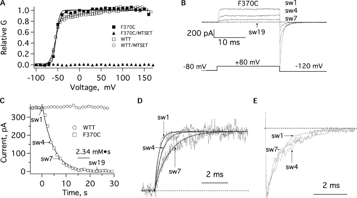 Figure 3. . MTSET effects on ionic currents of Shaker WTT and F370C mutant channels. (A) Activation curves of WTT and F370C channels, before and after 10.8 mM·s exposure to MTSET. Plotted is the normalized tail current at −100 mV following depolarizations to the indicated voltages. Boltzmann fits yielded V1/2 = −51 ± 1 mV and z = 3.8 ± 0.4 for WTT, and V1/2 = −54 ± 1 mV and z = 6.4 ± 0.8 for F370C. After MTSET exposure, the WTT currents were essentially unchanged with V1/2 = −55 ± 0.8 mV and z = 3.6 ± 0.4. Tail currents in F370C channels were reduced from ∼1 nA to a residual <5 pA for all tested depolarizations. (B) F370C currents in an inside-out patch exposed to 0.5 mM MTSET (1 min old). Depolarizations were given to +80 mV from a −80 mV holding potential every 830 ms; currents from sweeps 1, 4, 7, and 19 are shown. (C) The elicited current is plotted as a function of cumulative MTSET exposure. There is no MTSET effect on WTT Shaker channels (circles). (D) Scaled activation time course of the F370C current sweeps shown in B. The rising phase slows down as the MTSET modification progresses. (E) The corresponding scaled tail currents. The deactivation time courses of the three sweeps are indistinguishable. In all experiments, the computed MTSET exposure was corrected for hydrolysis as described in materials and methods.
