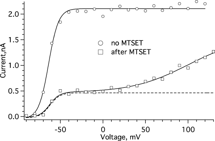 Figure 5. . Two components of activation in partially modified F370C channels. Before modification, a Boltzmann fit yields V1/2 = −63.8 ± 0.8 mV and z = 4.27 ± 0.5. After partial MTSET modification (7.7 mM·s), there is an additional, right-shifted component of activation, with z = 0.8 ± 0.2 and V1/2 estimated to be ∼+100 mV.