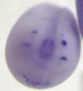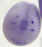 ascl1 (achaete-scute complex homolog 1) gene expression in Xenopus laevis embryos, NF stage 14, as assayed by in situ hybridization. Anterior view: dorsal up.