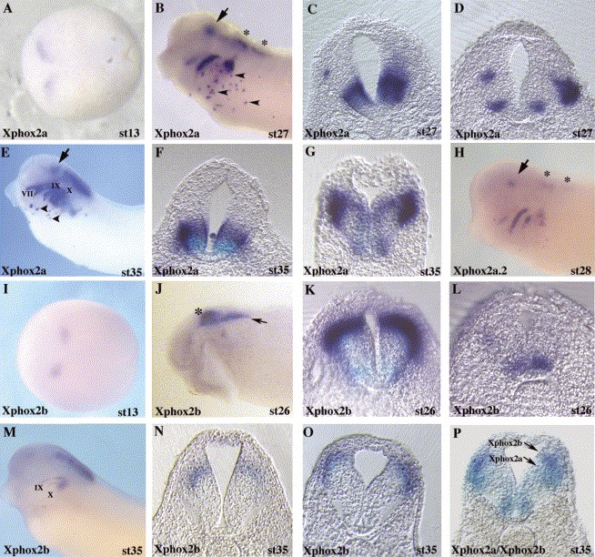 Fig. 2. Characterization of Xphox2a, Xphox2a.2 and Xphox2b expression in the Xenopus embryo. Whole-mount in situ hybridization was used to characterize Xphox2 gene expression during Xenopus development. Xphox2a (AâG) and Xphox2a.2(H) expression in the developing embryo. Similar results were obtained with both full-length and 3â² specific Xphox2a and Xphox2a.2 probes as outlined in the text and Experimental Procedures. Panels (AâG) show staining with full-length Xphox2a probe. Arrow marks ventralmidbrain domain of Xphox2a expression at stage 27 (B) and stage 35 (E). This ventral domain is further documented in transverse sections at these stages (C,F). Asterisks mark zones of Xphox2a and Xphox2a.2 expression in the hindbrain (B,H). Transverse sections through posteriorhindbrain domains of Xphox2a stained embryos are shown at stage 27 (D) and stage 35 (G). Note that the stage 27 embryo was imbedded asymmetrically and staining in (D) is therefore asymmetric due to the combination of thick sections (30 μm) and discontinuous zones of Xphox2a expression within this region. (IâO) Xphox2b expression in the developing embryo. Asterisk marks anteriorhindbrain domain of Xphox2b expression (J) also shown in transverse section at stage 26 (K) and stage 35 (N). Arrow marks posteriorhindbrainXphox2b staining (J) also shown at stage 26 (L) and stage 35 (O). In (P) a cross-section through the hindbrain of an embryo double hybridized with Xphox2a and Xphox2b probes is shown. The Xphox2a domain is blue and the Xphox2b domain is magenta/purple.