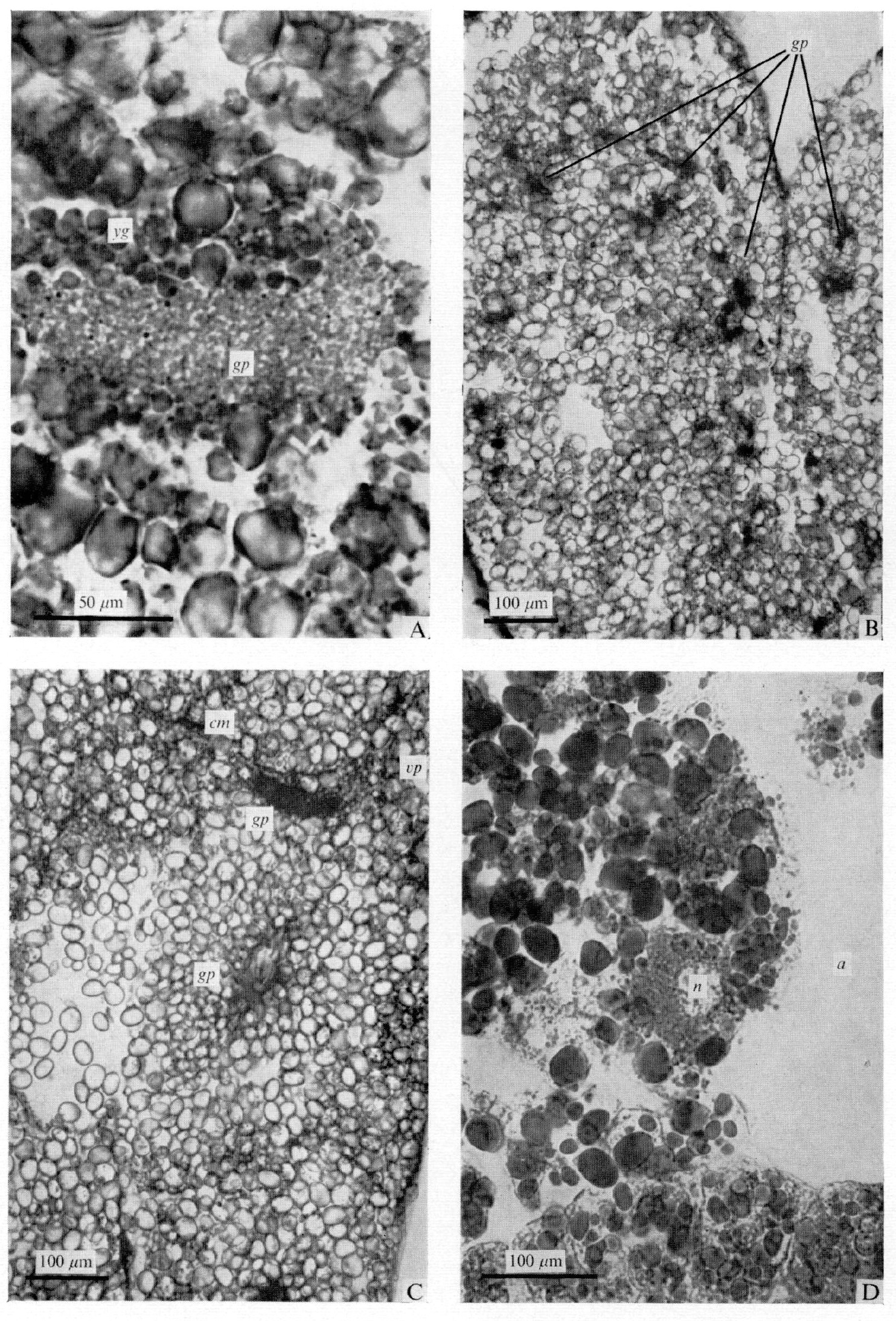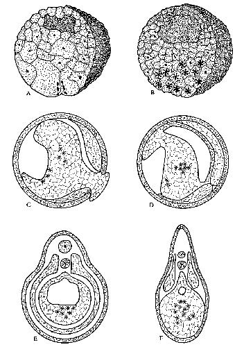 in embryos of different ages: (A) morula, (B) blastula, (C) mid-gastrula, (D) completed