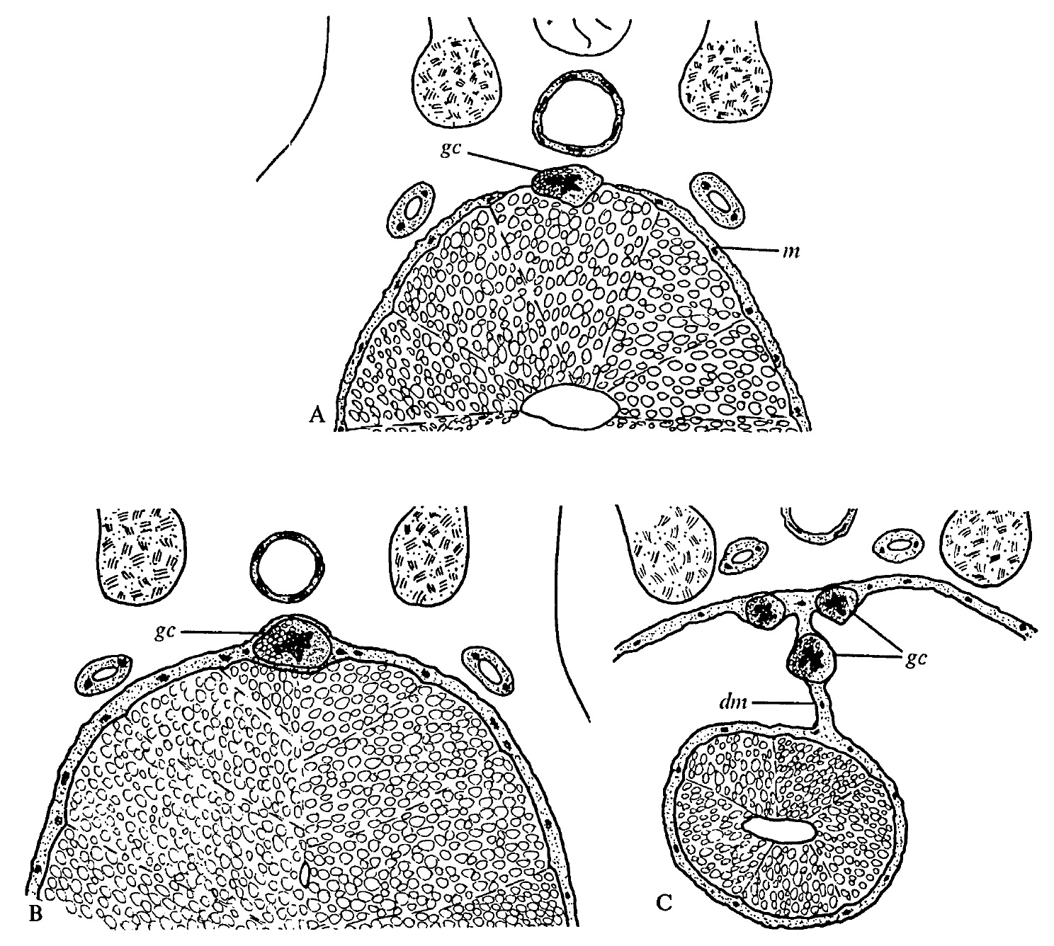 the germ cells (gc) lie at the top of the endoderm and the two mesodermal sheets (m)