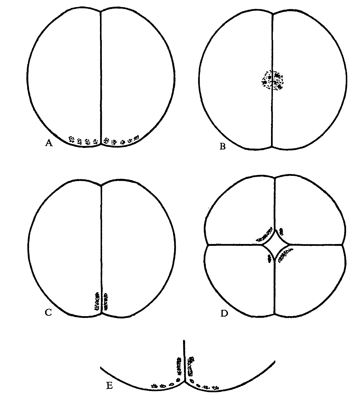 (B) The position of the germ plasm in the 2-cell stage, horizontal section taken