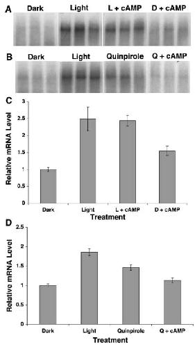 Fig. 2. Northern analysis of the effects of light, quinpirole, and pCPT-cAMP
