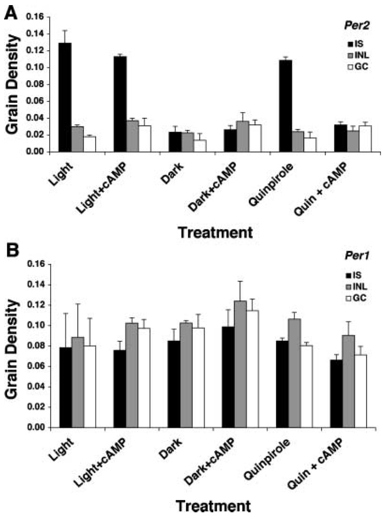 Fig. 3. In situ hybridization with 33P-labled RNA probes showing that light and quinpirole induce xPer2 mRNA specifically in photoreceptors and the effect of