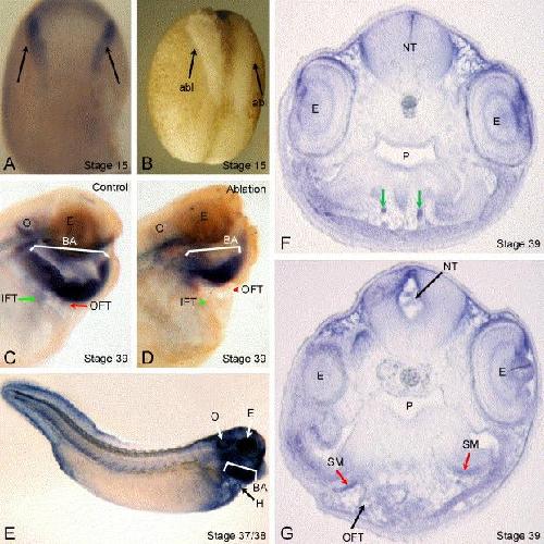 Fig. 6. Results of Xenopus neural crest ablation and xId2 expression patterns. (A, B) xSlug expression in the neural crest was used as a guide (A) for stage 15 neural crest ablations (B, abl). (C, D) Whole-mount xId2 in situ hybridization (ISH) was carried out on stage 39 control and neural crest ablated embryos. (C) There is xId2 expression in both the inflow tract (IFT) (green arrow) and outflow tract (OFT) (red arrow) of the developing heart, as well as the otic vesicle (O), eye (E), and branchial arches (BA) in the control embryo. (D) In the ablated stage 39 embryo, there is lack of expression in the IFT (green arrowhead), OFT (red arrowhead), and reduced expression in the BA. (EâG) Control embryos underwent whole-mount in situ hybridization (ISH) for xId2 and were fixed at stage 37/38 for whole-mount analysis and at stage 39 for sectional analysis. (E) xId2 expression is located in the branchial arches (BA), eye (E), otic vesicle (O), and heart (H). (F, G) xId2 expression is located in the neural tube (NT), eye (E), outflow tract (OFT), pharynx (P), nerve ganglion (green arrows), and splanchnic mesoderm (SM, red arrows).